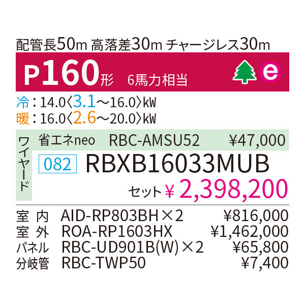 カテゴリ 業務用エアコン 型番 RBXB16033MUB 定価 2,638,020円 販売価格 税込 702,000円 詳細 ■メーカー:東芝 ■モデル名:2023年モデル ■タイプ名:パッケージエアコン / ビルトイン / ツイン(室内機2台×室外機1台) / ウルトラパワーエコ ■能力:6馬力(P160形) /【平米数】94~139㎡ /【坪数】28~42坪 /【畳数】56~84畳 ■電源:三相200V ■室内機:AID-RP803BH x2 ■室外機:ROA-RP1603HX x1 ●室内機サイズ:高さ275mm×幅1000mm×奥行925mm ●室外機サイズ:高さ1550mm×幅1010mm×奥行370mm ■通年エネルギー消費効率:5.5 ■その他機能等 ・ワイヤード ・ドライ運転 ・冷暖自動運転 ・ホットスタート ・風量切換(5段階) ・スマート節約運転 ・除霜連携 ・ドレンアップ機能 ・全熱交換ユニット連動 ※記載された情報は商品仕様の一部ですので、詳細はメーカーサイトにてご確認ください。 ※標準取付工事のほか、家電量販店では対応困難な『隠ぺい配管工事』も承ります。