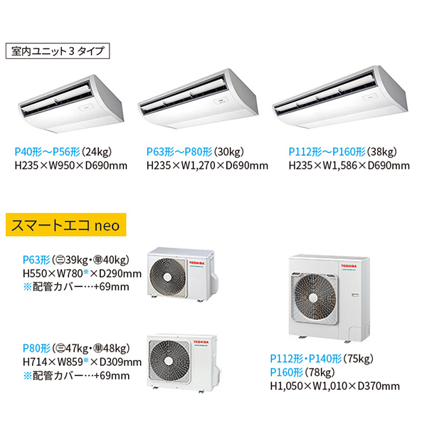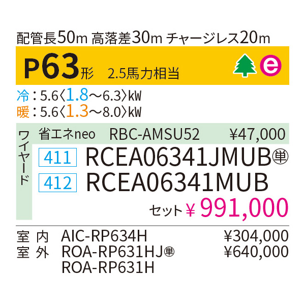カテゴリ 業務用エアコン 型番 RCEA06341MUB / RCEA06341JMUB 定価 1,090,100円 販売価格 税込 230,000円 詳細 ■メーカー:東芝 ■モデル名:2023年モデル ■タイプ名:パッケージエアコン / 天井吊り形1方向 / シングル(室内機1台×室外機1台) / 大清快 / スマートエコneo ■能力:2.5馬力(P63形) /【平米数】37~55㎡ /【坪数】11~16坪 /【畳数】22~32畳 ■電源:三相200V / 単相200V ■室内機:AIC-RP634H ■室外機:ROA-RP631H / ROA-RP631HJ ●室内機サイズ:高さ235mm×幅1270mm×奥行690mm ●室外機サイズ:高さ550mm×幅780(+69)mm×奥行290mm ■通年エネルギー消費効率:6.1 ■その他機能等 ・ワイヤード ・プラズマ空清 ・冷暖自動運転 ・ホットスタート ・風量切換(5段階) ・オートスイング ・オートフラップ ・除霜連携 ・天井汚れ防止風吹出し ※記載された情報は商品仕様の一部ですので、詳細はメーカーサイトにてご確認ください。 ※標準取付工事のほか、家電量販店では対応困難な『隠ぺい配管工事』も承ります。