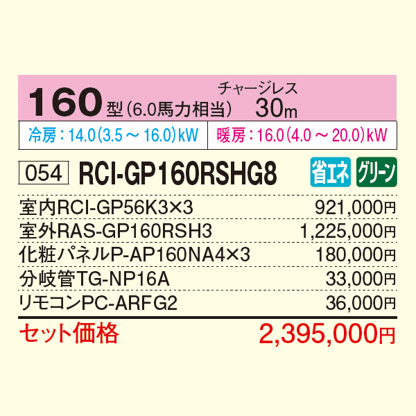カテゴリ 業務用エアコン 型番 RCI-GP160RSHG8 定価 2,634,500円 販売価格 税込 554,000円 送料 東京・神奈川全域:無料(一部地域や離島を除く) 詳細 ■メーカー:日立 ■モデル名:2023年モデル ■タイプ名:パッケージエアコン / 天井埋込形4方向 / 省エネの達人 / トリプル(室内機3台×室外機1台) ■能力:6馬力(P160形) /【平米数】94~139㎡ /【坪数】28~42坪 /【畳数】56~84畳 ■電源:三相200V ■室内機:RCI-GP56K3 x3 ■室外機:RAS-GP160RSH3 ●室内機サイズ:高さ248mm×幅950mm×奥行950mm ●室外機サイズ:高さ1140mm×幅950mm×奥行370mm ■通年エネルギー消費効率:6.1 ■その他機能等 ・ワイヤード ・熱交換器(凍結洗浄) ・オートルーバー ・風向選択(固定) ・風量調整4段 ・ドライ ・高天井対応 ・ホットスタート ・冷房外気(-5℃) ・フィルター自動清掃ユニット(別売) ※記載された情報は商品仕様の一部ですので、詳細はメーカーサイトにてご確認ください。 ※標準取付工事のほか、家電量販店では対応困難な『隠ぺい配管工事』も承ります。