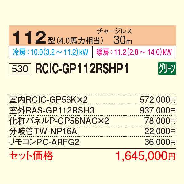カテゴリ 業務用エアコン 型番 RCIC-GP112RSHP1 定価 1,809,500円 販売価格 税込 381,000円 送料 東京・神奈川全域:無料(一部地域や離島を除く) 詳細 ■メーカー:日立 ■モデル名:2023年モデル ■タイプ名:パッケージエアコン / コンパクト4方向 / てんかせJr. / 省エネの達人 / ツイン(室内機2台×室外機1台) ■能力:4馬力(P112形) /【平米数】66~97㎡ /【坪数】20~29坪 /【畳数】40~58畳 ■電源:三相200V ■室内機:RCIC-GP56K x2 ■室外機:RAS-GP112RSH3 ●室内機サイズ:高さ285mm×幅620mm×奥行620mm ●室外機サイズ:高さ800mm×幅950mm×奥行370mm ■通年エネルギー消費効率:5.5 ■その他機能等 ・ワイヤード ・熱交換器(凍結洗浄) ・オートルーバー ・風向選択(固定) ・風量調整4段 ・ドライ ・ホットスタート ・冷房外気(-5℃) ・冷えすぎ抑制 ※記載された情報は商品仕様の一部ですので、詳細はメーカーサイトにてご確認ください。 ※標準取付工事のほか、家電量販店では対応困難な『隠ぺい配管工事』も承ります。