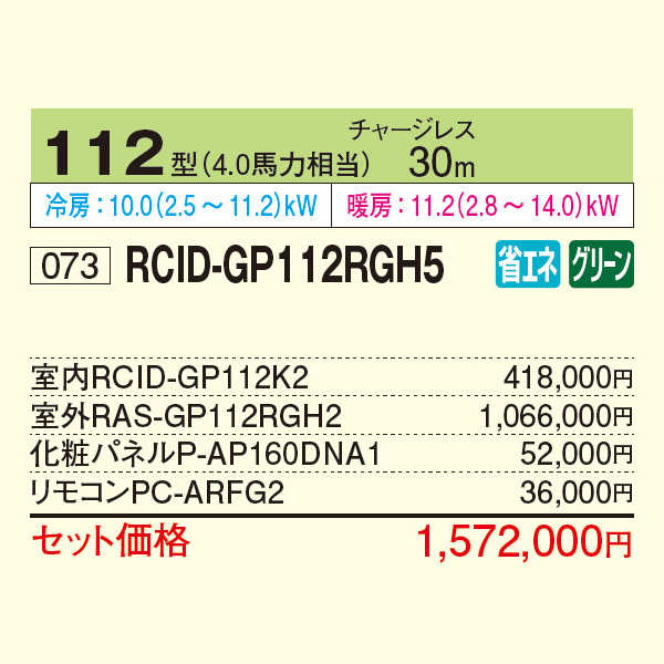 カテゴリ 業務用エアコン 型番 RCID-GP112RGH5 定価 1,729,200円 販売価格 税込 389,000円 送料 東京・神奈川全域:無料(一部地域や離島を除く) 詳細 ■メーカー:日立 ■モデル名:2023年モデル ■タイプ名:パッケージエアコン / 天井埋込形2方向 / 省エネの達人プレミアム / シングル(室内機1台×室外機1台) ■能力:4馬力(P112形) /【平米数】66~97㎡ /【坪数】20~29坪 /【畳数】40~58畳 ■電源:三相200V ■室内機:RCID-GP112K2 ■室外機:RAS-GP112RGH2 ●室内機サイズ:高さ345mm×幅1660mm×奥行710mm ●室外機サイズ:高さ1380mm×幅950mm×奥行370mm ■通年エネルギー消費効率:6 ■その他機能等 ・ワイヤード ・熱交換器(凍結洗浄) ・オートルーバー ・風向選択(固定) ・風量調整4段 ・ドライ ・高天井対応 ・ホットスタート ・冷房外気(-5℃) ・人感センサーキット(別売) ※記載された情報は商品仕様の一部ですので、詳細はメーカーサイトにてご確認ください。 ※標準取付工事のほか、家電量販店では対応困難な『隠ぺい配管工事』も承ります。