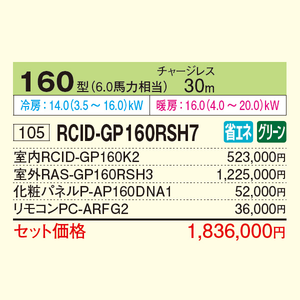 カテゴリ 業務用エアコン 型番 RCID-GP160RSH7 定価 2,019,600円 販売価格 税込 425,000円 送料 東京・神奈川全域:無料(一部地域や離島を除く) 詳細 ■メーカー:日立 ■モデル名:2023年モデル ■タイプ名:パッケージエアコン / 天井埋込形2方向 / 省エネの達人 / シングル(室内機1台×室外機1台) ■能力:6馬力(P160形) /【平米数】94~139㎡ /【坪数】28~42坪 /【畳数】56~84畳 ■電源:三相200V ■室内機:RCID-GP160K2 ■室外機:RAS-GP160RSH3 ●室内機サイズ:高さ345mm×幅1660mm×奥行710mm ●室外機サイズ:高さ1140mm×幅950mm×奥行370mm ■通年エネルギー消費効率:5.3 ■その他機能等 ・ワイヤード ・熱交換器(凍結洗浄) ・オートルーバー ・風向選択(固定) ・風量調整4段 ・ドライ ・高天井対応 ・ホットスタート ・冷房外気(-5℃) ・人感センサーキット(別売) ※記載された情報は商品仕様の一部ですので、詳細はメーカーサイトにてご確認ください。 ※標準取付工事のほか、家電量販店では対応困難な『隠ぺい配管工事』も承ります。