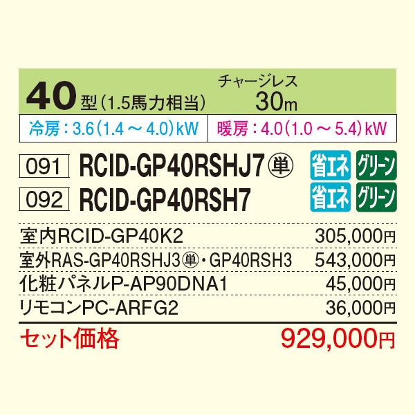 カテゴリ 業務用エアコン 型番 RCID-GP40RSHJ7 / RCID-GP40RSH7 定価 1,021,900円 販売価格 税込 216,000円 送料 東京・神奈川全域:無料(一部地域や離島を除く) 詳細 ■メーカー:日立 ■モデル名:2023年モデル ■タイプ名:パッケージエアコン / 天井埋込形2方向 / 省エネの達人 / シングル(室内機1台×室外機1台) ■能力:1.5馬力(P40形) /【平米数】24~35㎡ /【坪数】7~10坪 /【畳数】14~20畳 ■電源:単相200V / 三相200V ■室内機:RCID-GP40K2 ■室外機:RAS-GP40RSHJ3 / RAS-GP40RSH3 ●室内機サイズ:高さ345mm×幅1100mm×奥行710mm ●室外機サイズ:高さ629mm×幅799(+99)mm×奥行300mm ■通年エネルギー消費効率:5.7 ■その他機能等 ・ワイヤード ・熱交換器(凍結洗浄) ・オートルーバー ・風向選択(固定) ・風量調整4段 ・ドライ ・高天井対応 ・ホットスタート ・冷房外気(-5℃) ・人感センサーキット(別売) ※記載された情報は商品仕様の一部ですので、詳細はメーカーサイトにてご確認ください。 ※標準取付工事のほか、家電量販店では対応困難な『隠ぺい配管工事』も承ります。