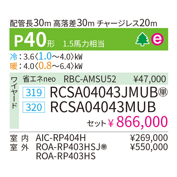 カテゴリ 業務用エアコン 型番 RCSA04043MUB / RCSA04043JMUB 定価 952,600円 販売価格 税込 201,000円 詳細 ■メーカー:東芝 ■モデル名:2023年モデル ■タイプ名:パッケージエアコン / 天井吊り形1方向 / シングル(室内機1台×室外機1台) / 大清快 / スーパーパワーエコゴールド ■能力:1.5馬力(P40形) /【平米数】24~35㎡ /【坪数】7~10坪 /【畳数】14~20畳 ■電源:三相200V / 単相200V ■室内機:AIC-RP404H ■室外機:ROA-RP403HS / ROA-RP403HSJ ●室内機サイズ:高さ235mm×幅950mm×奥行690mm ●室外機サイズ:高さ550mm×幅780(+69)mm×奥行290mm ■通年エネルギー消費効率:5.8 ■その他機能等 ・ワイヤード ・プラズマ空清 ・冷暖自動運転 ・ホットスタート ・風量切換(5段階) ・オートスイング ・オートフラップ ・除霜連携 ・天井汚れ防止風吹出し ※記載された情報は商品仕様の一部ですので、詳細はメーカーサイトにてご確認ください。 ※標準取付工事のほか、家電量販店では対応困難な『隠ぺい配管工事』も承ります。