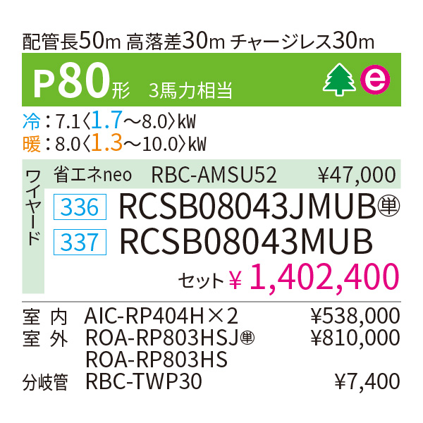 カテゴリ 業務用エアコン 型番 RCSB08043MUB / RCSB08043JMUB 定価 1,542,640円 販売価格 税込 325,000円 詳細 ■メーカー:東芝 ■モデル名:2023年モデル ■タイプ名:パッケージエアコン / 天井吊り形1方向 / ツイン(室内機2台×室外機1台) / 大清快 / スーパーパワーエコゴールド ■能力:3馬力(P80形) /【平米数】47~70㎡ /【坪数】14~21坪 /【畳数】28~42畳 ■電源:三相200V / 単相200V ■室内機:AIC-RP404H x2 ■室外機:ROA-RP803HS x1 / ROA-RP803HSJ x1 ●室内機サイズ:高さ235mm×幅950mm×奥行690mm ●室外機サイズ:高さ714mm×幅859(+69)mm×奥行309mm ■通年エネルギー消費効率:6 ■その他機能等 ・ワイヤード ・プラズマ空清 ・冷暖自動運転 ・ホットスタート ・風量切換(5段階) ・オートスイング ・オートフラップ ・除霜連携 ・天井汚れ防止風吹出し ※記載された情報は商品仕様の一部ですので、詳細はメーカーサイトにてご確認ください。 ※標準取付工事のほか、家電量販店では対応困難な『隠ぺい配管工事』も承ります。