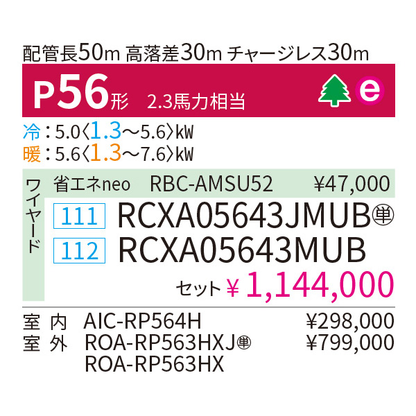 カテゴリ 業務用エアコン 型番 RCXA05643MUB / RCXA05643JMUB 定価 1,258,400円 販売価格 税込 336,000円 詳細 ■メーカー:東芝 ■モデル名:2023年モデル ■タイプ名:パッケージエアコン / 天井吊り形1方向 / シングル(室内機1台×室外機1台) / 大清快 / ウルトラパワーエコ ■能力:2.3馬力(P56形) /【平米数】33~49㎡ /【坪数】10~14坪 /【畳数】20~28畳 ■電源:三相200V / 単相200V ■室内機:AIC-RP564H ■室外機:ROA-RP563HX / ROA-RP563HXJ ●室内機サイズ:高さ235mm×幅950mm×奥行690mm ●室外機サイズ:高さ714mm×幅859(+69)mm×奥行309mm ■通年エネルギー消費効率:6.7 ■その他機能等 ・ワイヤード ・プラズマ空清 ・冷暖自動運転 ・ホットスタート ・風量切換(5段階) ・オートスイング ・オートフラップ ・除霜連携 ・天井汚れ防止風吹出し ※記載された情報は商品仕様の一部ですので、詳細はメーカーサイトにてご確認ください。 ※標準取付工事のほか、家電量販店では対応困難な『隠ぺい配管工事』も承ります。