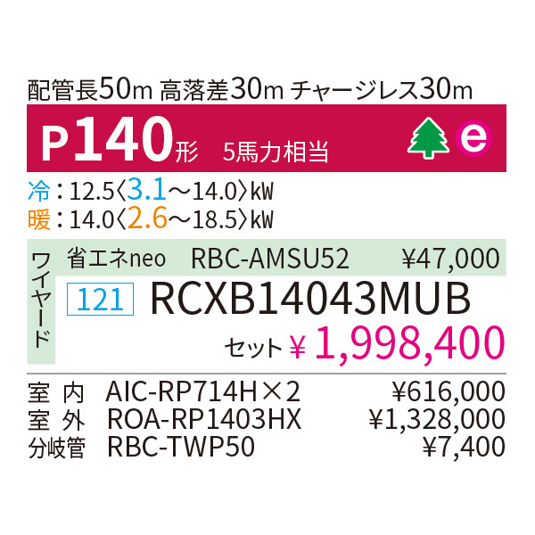 カテゴリ 業務用エアコン 型番 RCXB14043MUB 定価 2,198,240円 販売価格 税込 586,000円 詳細 ■メーカー:東芝 ■モデル名:2023年モデル ■タイプ名:パッケージエアコン / 天井吊り形1方向 / ツイン(室内機2台×室外機1台) / 大清快 / ウルトラパワーエコ ■能力:5馬力(P140形) /【平米数】82~122㎡ /【坪数】24~36坪 /【畳数】48~72畳 ■電源:三相200V ■室内機:AIC-RP714H x2 ■室外機:ROA-RP1403HX x1 ●室内機サイズ:高さ235mm×幅1270mm×奥行690mm ●室外機サイズ:高さ1550mm×幅1010mm×奥行370mm ■通年エネルギー消費効率:5.8 ■その他機能等 ・ワイヤード ・プラズマ空清 ・冷暖自動運転 ・ホットスタート ・風量切換(5段階) ・オートスイング ・オートフラップ ・除霜連携 ・天井汚れ防止風吹出し ※記載された情報は商品仕様の一部ですので、詳細はメーカーサイトにてご確認ください。 ※標準取付工事のほか、家電量販店では対応困難な『隠ぺい配管工事』も承ります。