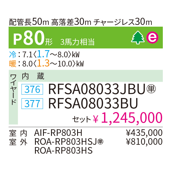 カテゴリ 業務用エアコン 型番 RFSA08033BU / RFSA08033JBU 定価 1,369,500円 販売価格 税込 289,000円 詳細 ■メーカー:東芝 ■モデル名:2021年モデル ■タイプ名:パッケージエアコン / 床置き形 / シングル(室内機1台×室外機1台) / スーパーパワーエコゴールド ■能力:3馬力(P80形) /【平米数】47~70㎡ /【坪数】14~21坪 /【畳数】28~42畳 ■電源:三相200V / 単相200V ■室内機:AIF-RP803H ■室外機:ROA-RP803HS / ROA-RP803HSJ ●室内機サイズ:高さ1750mm×幅600mm×奥行210mm ●室外機サイズ:高さ714mm×幅859(+69)mm×奥行309mm ■通年エネルギー消費効率:5.1 ■その他機能等 ・ワイヤード ・オートスイング ・ホットスタート ・風量切換(5段階) ・冷暖自動運転 ・スマート節約運転 ・ドライ運転 ・セーブ運転 ・除霜連携 ※記載された情報は商品仕様の一部ですので、詳細はメーカーサイトにてご確認ください。 ※標準取付工事のほか、家電量販店では対応困難な『隠ぺい配管工事』も承ります。