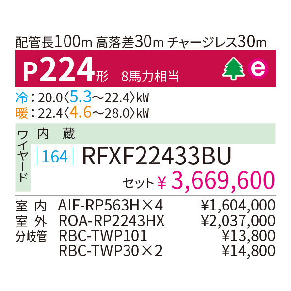 カテゴリ 業務用エアコン 型番 RFXF22433BU 定価 4,036,560円 販売価格 税込 1,075,000円 詳細 ■メーカー:東芝 ■モデル名:2021年モデル ■タイプ名:パッケージエアコン / 床置き形 / ダブルツイン(室内機4台×室外機1台) / ウルトラパワーエコ ■能力:8馬力(P224形) /【平米数】132~195㎡ /【坪数】40~59坪 /【畳数】80~118畳 ■電源:三相200V ■室内機:AIF-RP563H x4 ■室外機:ROA-RP2243HX ●室内機サイズ:高さ1750mm×幅600mm×奥行210mm ●室外機サイズ:高さ1550mm×幅1010mm×奥行370mm ■通年エネルギー消費効率:5.1 ■その他機能等 ・ワイヤード ・オートスイング ・ホットスタート ・風量切換(5段階) ・冷暖自動運転 ・スマート節約運転 ・ドライ運転 ・セーブ運転 ・除霜連携 ※記載された情報は商品仕様の一部ですので、詳細はメーカーサイトにてご確認ください。 ※標準取付工事のほか、家電量販店では対応困難な『隠ぺい配管工事』も承ります。