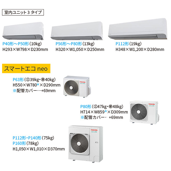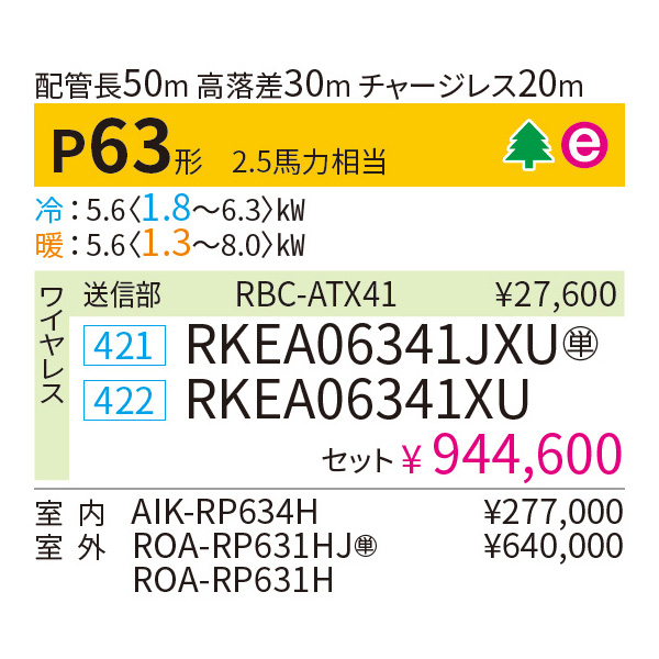 カテゴリ 業務用エアコン 型番 RKEA06341XU / RKEA06341JXU 定価 1,039,060円 販売価格 税込 219,000円 詳細 ■メーカー:東芝 ■モデル名:2021年モデル ■タイプ名:パッケージエアコン / 壁掛け形 / シングル(室内機1台×室外機1台) / スマートエコneo ■能力:2.5馬力(P63形) /【平米数】37~55㎡ /【坪数】11~16坪 /【畳数】22~32畳 ■電源:三相200V / 単相200V ■室内機:AIK-RP634H ■室外機:ROA-RP631H / ROA-RP631HJ ●室内機サイズ:高さ320mm×幅1050mm×奥行250mm ●室外機サイズ:高さ550mm×幅780(+69)mm×奥行290mm ■通年エネルギー消費効率:5.5 ■その他機能等 ・ワイヤレス ・オートスイング ・オートフラップ ・ホットスタート ・風量切換(5段階) ・スマート節約運転 ・冷暖自動運転 ・除霜連携 ・天井汚れ防止風吹出し ※記載された情報は商品仕様の一部ですので、詳細はメーカーサイトにてご確認ください。 ※標準取付工事のほか、家電量販店では対応困難な『隠ぺい配管工事』も承ります。