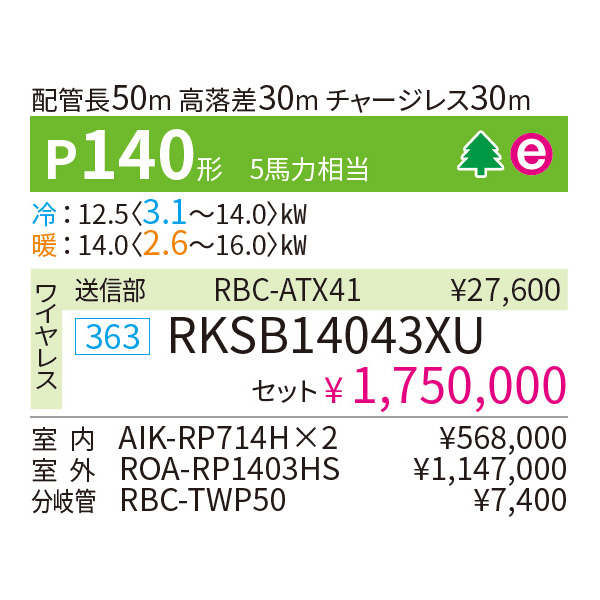 カテゴリ 業務用エアコン 型番 RKSB14043XU 定価 1,925,000円 販売価格 税込 405,000円 詳細 ■メーカー:東芝 ■モデル名:2021年モデル ■タイプ名:パッケージエアコン / 壁掛け形 / ツイン(室内機2台×室外機1台) / スーパーパワーエコゴールド ■能力:5馬力(P140形) /【平米数】82~122㎡ /【坪数】24~36坪 /【畳数】48~72畳 ■電源:三相200V ■室内機:AIK-RP714H x2 ■室外機:ROA-RP1403HS ●室内機サイズ:高さ320mm×幅1050mm×奥行250mm ●室外機サイズ:高さ1050mm×幅1010mm×奥行370mm ■通年エネルギー消費効率:5.3 ■その他機能等 ・ワイヤレス ・オートスイング ・オートフラップ ・ホットスタート ・風量切換(5段階) ・スマート節約運転 ・冷暖自動運転 ・除霜連携 ・天井汚れ防止風吹出し ※記載された情報は商品仕様の一部ですので、詳細はメーカーサイトにてご確認ください。 ※標準取付工事のほか、家電量販店では対応困難な『隠ぺい配管工事』も承ります。