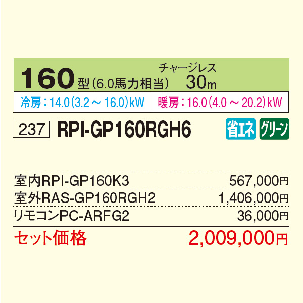 カテゴリ 業務用エアコン 型番 RPI-GP160RGH6 定価 2,209,900円 販売価格 税込 497,000円 送料 東京・神奈川全域:無料(一部地域や離島を除く) 詳細 ■メーカー:日立 ■モデル名:2023年モデル ■タイプ名:パッケージエアコン / ダクト形 / てんうめ(高静圧) / 省エネの達人プレミアム / シングル(室内機1台×室外機1台) ■能力:6馬力(P160形) /【平米数】94~139㎡ /【坪数】28~42坪 /【畳数】56~84畳 ■電源:三相200V ■室内機:RPI-GP160K3 ■室外機:RAS-GP160RGH2 ●室内機サイズ:高さ300mm×幅1400mm×奥行800mm ●室外機サイズ:高さ1380mm×幅950mm×奥行370mm ■通年エネルギー消費効率:5.4 ■その他機能等 ・ワイヤード ・熱交換器(凍結洗浄) ・全熱交連動運転対応 ・風量調整4段 ・ドライ ・ホットスタート ・冷房外気(-5℃) ・タイマー運転 ・加湿器(別売) ・人感センサーキット(別売) ※記載された情報は商品仕様の一部ですので、詳細はメーカーサイトにてご確認ください。 ※標準取付工事のほか、家電量販店では対応困難な『隠ぺい配管工事』も承ります。