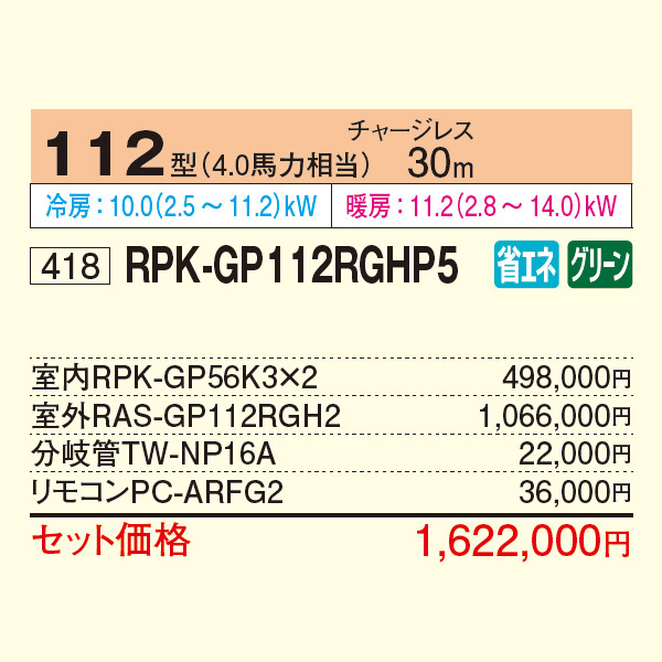 カテゴリ 業務用エアコン 型番 RPK-GP112RGHP5 定価 1,784,200円 販売価格 税込 401,000円 送料 東京・神奈川全域:無料(一部地域や離島を除く) 詳細 ■メーカー:日立 ■モデル名:2023年モデル ■タイプ名:パッケージエアコン / 壁掛け形 / 省エネの達人プレミアム / ツイン(室内機2台×室外機1台) ■能力:4馬力(P112形) /【平米数】66~97㎡ /【坪数】20~29坪 /【畳数】40~58畳 ■電源:三相200V ■室内機:RPK-GP56K3 x2 ■室外機:RAS-GP112RGH2 ●室内機サイズ:高さ300mm×幅1100mm×奥行260mm ●室外機サイズ:高さ1380mm×幅950mm×奥行370mm ■通年エネルギー消費効率:5.6 ■その他機能等 ・ワイヤード ・熱交換器(凍結洗浄) ・オートルーバー ・風向選択(固定) ・風量調整4段 ・ドライ ・ホットスタート ・冷房外気(-5℃) ・タイマー運転 ※記載された情報は商品仕様の一部ですので、詳細はメーカーサイトにてご確認ください。 ※標準取付工事のほか、家電量販店では対応困難な『隠ぺい配管工事』も承ります。