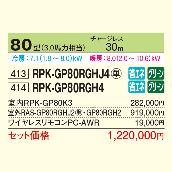 カテゴリ 業務用エアコン 型番 RPK-GP80RGHJ4 / RPK-GP80RGH4 定価 1,342,000円 販売価格 税込 302,000円 送料 東京・神奈川全域:無料(一部地域や離島を除く) 詳細 ■メーカー:日立 ■モデル名:2023年モデル ■タイプ名:パッケージエアコン / 壁掛け形 / 省エネの達人プレミアム / シングル(室内機1台×室外機1台) ■能力:3馬力(P80形) /【平米数】47~70㎡ /【坪数】14~21坪 /【畳数】28~42畳 ■電源:単相200V / 三相200V ■室内機:RPK-GP80K3 ■室外機:RAS-GP80RGHJ2 / RAS-GP80RGH2 ●室内機サイズ:高さ300mm×幅1100mm×奥行260mm ●室外機サイズ:高さ709mm×幅859(+100)mm×奥行319mm ■通年エネルギー消費効率:5.4 ■その他機能等 ・ワイヤード ・熱交換器(凍結洗浄) ・オートルーバー ・風向選択(固定) ・風量調整4段 ・ドライ ・ホットスタート ・冷房外気(-5℃) ・タイマー運転 ※記載された情報は商品仕様の一部ですので、詳細はメーカーサイトにてご確認ください。 ※標準取付工事のほか、家電量販店では対応困難な『隠ぺい配管工事』も承ります。