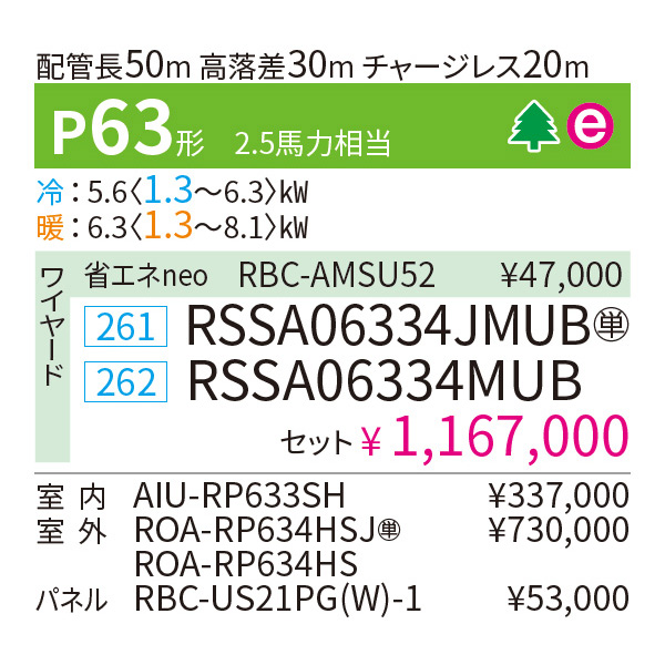 カテゴリ 業務用エアコン 型番 RSSA06334MUB / RSSA06334JMUB 定価 1,283,700円 販売価格 税込 271,000円 詳細 ■メーカー:東芝 ■モデル名:2023年モデル ■タイプ名:パッケージエアコン / 天井埋込形1方向 / シングル(室内機1台×室外機1台) / スーパーパワーエコゴールド ■能力:2.5馬力(P63形) /【平米数】37~55㎡ /【坪数】11~16坪 /【畳数】22~32畳 ■電源:三相200V / 単相200V ■室内機:AIU-RP633SH ■室外機:ROA-RP634HS / ROA-RP634HSJ ●室内機サイズ:高さ200mm×幅1000mm×奥行710mm ●室外機サイズ:高さ550mm×幅780(+69)mm×奥行290mm ■通年エネルギー消費効率:5.6 ■その他機能等 ・ワイヤード ・オートスイング ・オートフラップ ・ホットスタート ・風量切換(5段階) ・スマート節約運転 ・冷暖自動運転 ・除霜連携 ・天井汚れ防止風吹出し ※記載された情報は商品仕様の一部ですので、詳細はメーカーサイトにてご確認ください。 ※標準取付工事のほか、家電量販店では対応困難な『隠ぺい配管工事』も承ります。