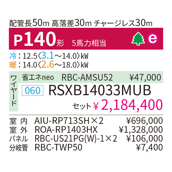 カテゴリ 業務用エアコン 型番 RSXB14033MUB 定価 2,402,840円 販売価格 税込 641,000円 詳細 ■メーカー:東芝 ■モデル名:2023年モデル ■タイプ名:パッケージエアコン / 天井埋込形1方向 / ツイン(室内機2台×室外機1台) / ウルトラパワーエコ ■能力:5馬力(P140形) /【平米数】82~122㎡ /【坪数】24~36坪 /【畳数】48~72畳 ■電源:三相200V ■室内機:AIU-RP713SH x2 ■室外機:ROA-RP1403HX x1 ●室内機サイズ:高さ200mm×幅1000mm×奥行710mm ●室外機サイズ:高さ1550mm×幅1010mm×奥行370mm ■通年エネルギー消費効率:5.5 ■その他機能等 ・ワイヤード ・オートスイング ・オートフラップ ・ホットスタート ・風量切換(5段階) ・スマート節約運転 ・冷暖自動運転 ・除霜連携 ・天井汚れ防止風吹出し ※記載された情報は商品仕様の一部ですので、詳細はメーカーサイトにてご確認ください。 ※標準取付工事のほか、家電量販店では対応困難な『隠ぺい配管工事』も承ります。