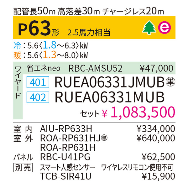 カテゴリ 業務用エアコン 型番 RUEA06331MUB / RUEA06331JMUB 定価 1,191,850円 販売価格 税込 251,000円 詳細 ■メーカー:東芝 ■モデル名:2023年モデル ■タイプ名:パッケージエアコン / 天井埋込形4方向 / シングル(室内機1台×室外機1台) / スマートエコneo ■能力:2.5馬力(P63形) /【平米数】37~55㎡ /【坪数】11~16坪 /【畳数】22~32畳 ■電源:三相200V / 単相200V ■室内機:AIU-RP633H ■室外機:ROA-RP631H / ROA-RP631HJ ●室内機サイズ:高さ256mm×幅840mm×奥行840mm ●室外機サイズ:高さ780(+69)mm×幅550mm×奥行290mm ■通年エネルギー消費効率:6.6 ■その他機能等 ・ワイヤード ・オートスイング ・オートフラップ ・個別フラップポジション ・風量切換(5段階) ・スマート節約運転 ・冷暖自動運転 ・除霜連携 ・天井汚れ防止風吹出し ※記載された情報は商品仕様の一部ですので、詳細はメーカーサイトにてご確認ください。 ※標準取付工事のほか、家電量販店では対応困難な『隠ぺい配管工事』も承ります。