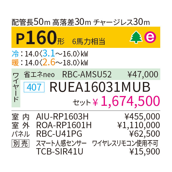 カテゴリ 業務用エアコン 型番 RUEA16031MUB 定価 1,841,950円 販売価格 税込 388,000円 詳細 ■メーカー:東芝 ■モデル名:2023年モデル ■タイプ名:パッケージエアコン / 天井埋込形4方向 / シングル(室内機1台×室外機1台) / スマートエコneo ■能力:6馬力(P160形) /【平米数】94~139㎡ /【坪数】28~42坪 /【畳数】56~84畳 ■電源:三相200V ■室内機:AIU-RP1603H ■室外機:ROA-RP1601H ●室内機サイズ:高さ319mm×幅840mm×奥行840mm ●室外機サイズ:高さ1010mm×幅1050mm×奥行370mm ■通年エネルギー消費効率:5.7 ■その他機能等 ・ワイヤード ・オートスイング ・オートフラップ ・個別フラップポジション ・風量切換(5段階) ・スマート節約運転 ・冷暖自動運転 ・除霜連携 ・天井汚れ防止風吹出し ※記載された情報は商品仕様の一部ですので、詳細はメーカーサイトにてご確認ください。 ※標準取付工事のほか、家電量販店では対応困難な『隠ぺい配管工事』も承ります。