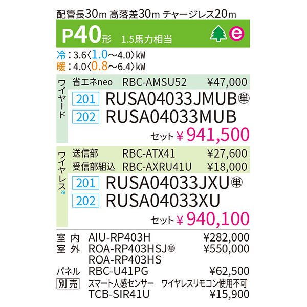 カテゴリ 業務用エアコン 型番 RUSA04033MUB / RUSA04033JMUB 定価 1,035,650円 販売価格 税込 218,000円 詳細 ■メーカー:東芝 ■モデル名:2023年モデル ■タイプ名:パッケージエアコン / 天井埋込形4方向 / シングル(室内機1台×室外機1台) / スーパーパワーエコゴールド ■能力:1.5馬力(P40形) /【平米数】24~35㎡ /【坪数】7~10坪 /【畳数】14~20畳 ■電源:三相200V / 単相200V ■室内機:AIU-RP403H ■室外機:ROA-RP403HS / ROA-RP403HSJ ●室内機サイズ:高さ256mm×幅840mm×奥行840mm ●室外機サイズ:高さ780(+69)mm×幅550mm×奥行290mm ■通年エネルギー消費効率:6.6 ■その他機能等 ・ワイヤード ・オートスイング ・オートフラップ ・個別フラップポジション ・風量切換(5段階) ・スマート節約運転 ・冷暖自動運転 ・除霜連携 ・天井汚れ防止風吹出し ※記載された情報は商品仕様の一部ですので、詳細はメーカーサイトにてご確認ください。 ※標準取付工事のほか、家電量販店では対応困難な『隠ぺい配管工事』も承ります。