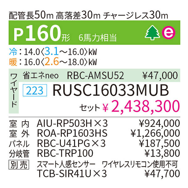 カテゴリ 業務用エアコン 型番 RUSC16033MUB 定価 2,682,130円 販売価格 税込 565,000円 詳細 ■メーカー:東芝 ■モデル名:2023年モデル ■タイプ名:パッケージエアコン / 天井埋込形4方向 / トリプル(室内機3台×室外機1台) / スーパーパワーエコゴールド ■能力:6馬力(P160形) /【平米数】94~139㎡ /【坪数】28~42坪 /【畳数】56~84畳 ■電源:三相200V ■室内機:AIU-RP503H x3 ■室外機:ROA-RP1603HS x1 ●室内機サイズ:高さ256mm×幅840mm×奥行840mm ●室外機サイズ:高さ1010mm×幅1050mm×奥行370mm ■通年エネルギー消費効率:5.9 ■その他機能等 ・ワイヤード ・オートスイング ・オートフラップ ・個別フラップポジション ・風量切換(5段階) ・スマート節約運転 ・冷暖自動運転 ・除霜連携 ・天井汚れ防止風吹出し ※記載された情報は商品仕様の一部ですので、詳細はメーカーサイトにてご確認ください。 ※標準取付工事のほか、家電量販店では対応困難な『隠ぺい配管工事』も承ります。