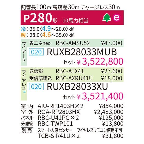 カテゴリ 業務用エアコン 型番 RUXB28033MUB 定価 3,875,080円 販売価格 税込 1,032,000円 詳細 ■メーカー:東芝 ■モデル名:2023年モデル ■タイプ名:パッケージエアコン / 天井埋込形4方向 / ツイン(室内機2台×室外機1台) / ウルトラパワーエコ ■能力:10馬力(P280形) /【平米数】165~243㎡ /【坪数】50~73坪 /【畳数】100~146畳 ■電源:三相200V ■室内機:AIU-RP1403H x2 ■室外機:ROA-RP2803HX x1 ●室内機サイズ:高さ319mm×幅840mm×奥行840mm ●室外機サイズ:高さ1550mm×幅1010mm×奥行370mm ■消費効率通年エネルギー消費効率:6 ■その他機能等 ・ワイヤード ・オートスイング ・オートフラップ ・個別フラップポジション ・風量切換(5段階) ・スマート節約運転 ・冷暖自動運転 ・除霜連携 ・天井汚れ防止風吹出し ※記載された情報は商品仕様の一部ですので、詳細はメーカーサイトにてご確認ください。 ※標準取付工事のほか、家電量販店では対応困難な『隠ぺい配管工事』も承ります。