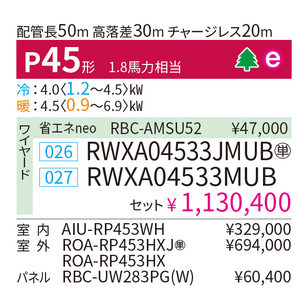 カテゴリ 業務用エアコン 型番 RWXA04533MUB / RWXA04533JMUB 定価 1,243,440円 販売価格 税込 332,000円 詳細 ■メーカー:東芝 ■モデル名:2023年モデル ■タイプ名:パッケージエアコン / 天井埋込形2方向 / シングル(室内機1台×室外機1台) / ウルトラパワーエコ ■能力:1.8馬力(P45形) /【平米数】26~39㎡ /【坪数】7~11坪 /【畳数】14~22畳 ■電源:三相200V / 単相200V ■室内機:AIU-RP453WH ■室外機:ROA-RP453HX ●室内機サイズ:高さ295mm×幅815mm×奥行570mm ●室外機サイズ:高さ780(+69)mm×幅550mm×奥行290mm ■通年エネルギー消費効率:6.1 ■その他機能等 ・ワイヤード ・オートスイング ・オートフラップ ・ホットスタート ・風量切換(5段階) ・スマート節約運転 ・冷暖自動運転 ・除霜連携 ・天井汚れ防止風吹出し ※記載された情報は商品仕様の一部ですので、詳細はメーカーサイトにてご確認ください。 ※標準取付工事のほか、家電量販店では対応困難な『隠ぺい配管工事』も承ります。