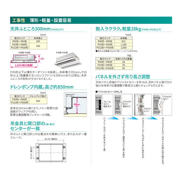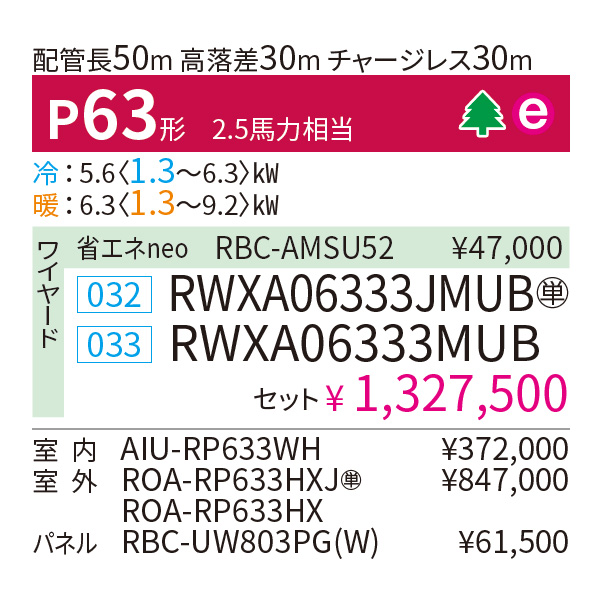 カテゴリ 業務用エアコン 型番 RWXA06333MUB / RWXA06333JMUB 定価 1,460,250円 販売価格 税込 390,000円 詳細 ■メーカー:東芝 ■モデル名:2023年モデル ■タイプ名:パッケージエアコン / 天井埋込形2方向 / シングル(室内機1台×室外機1台) / ウルトラパワーエコ ■能力:2.5馬力(P63形) /【平米数】37~55㎡ /【坪数】11~16坪 /【畳数】22~32畳 ■電源:三相200V / 単相200V ■室内機:AIU-RP633WH ■室外機:ROA-RP633HX ●室内機サイズ:高さ345mm×幅1180mm×奥行570mm ●室外機サイズ:高さ859(+69)mm×幅714mm×奥行309mm ■通年エネルギー消費効率:5.8 ■その他機能等 ・ワイヤード ・オートスイング ・オートフラップ ・ホットスタート ・風量切換(5段階) ・スマート節約運転 ・冷暖自動運転 ・除霜連携 ・天井汚れ防止風吹出し ※記載された情報は商品仕様の一部ですので、詳細はメーカーサイトにてご確認ください。 ※標準取付工事のほか、家電量販店では対応困難な『隠ぺい配管工事』も承ります。