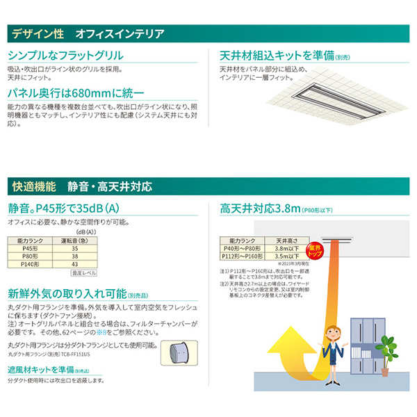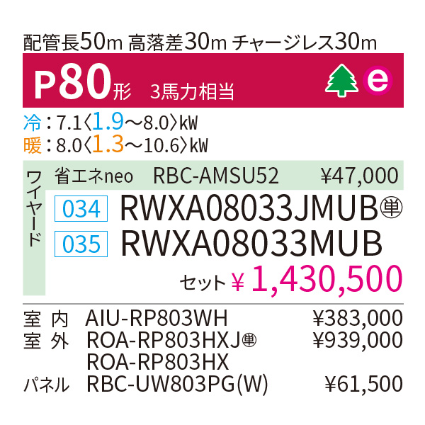 カテゴリ 業務用エアコン 型番 RWXA08033MUB / RWXA08033JMUB 定価 1,573,550円 販売価格 税込 420,000円 詳細 ■メーカー:東芝 ■モデル名:2023年モデル ■タイプ名:パッケージエアコン / 天井埋込形2方向 / シングル(室内機1台×室外機1台) / ウルトラパワーエコ ■能力:3馬力(P80形) /【平米数】47~70㎡ /【坪数】14~21坪 /【畳数】28~42畳 ■電源:三相200V / 単相200V ■室内機:AIU-RP803WH ■室外機:ROA-RP803HX ●室内機サイズ:高さ345mm×幅1180mm×奥行570mm ●室外機サイズ:高さ1010mm×幅1050mm×奥行370mm ■通年エネルギー消費効率:5.8 ■その他機能等 ・ワイヤード ・オートスイング ・オートフラップ ・ホットスタート ・風量切換(5段階) ・スマート節約運転 ・冷暖自動運転 ・除霜連携 ・天井汚れ防止風吹出し ※記載された情報は商品仕様の一部ですので、詳細はメーカーサイトにてご確認ください。 ※標準取付工事のほか、家電量販店では対応困難な『隠ぺい配管工事』も承ります。