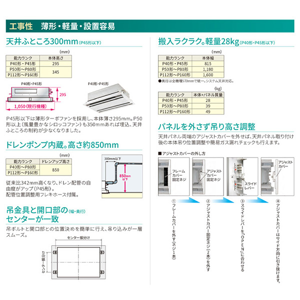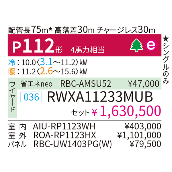 カテゴリ 業務用エアコン 型番 RWXA11233MUB 定価 1,793,550円 販売価格 税込 478,000円 詳細 ■メーカー:東芝 ■モデル名:2023年モデル ■タイプ名:パッケージエアコン / 天井埋込形2方向 / シングル(室内機1台×室外機1台) / ウルトラパワーエコ ■能力:4馬力(P112形) /【平米数】66~97㎡ /【坪数】20~29坪 /【畳数】40~58畳 ■電源:三相200V ■室内機:AIU-RP1123WH ■室外機:ROA-RP1123HX ●室内機サイズ:高さ345mm×幅1600mm×奥行570mm ●室外機サイズ:高さ1010mm×幅1550mm×奥行370mm ■通年エネルギー消費効率:5.7 ■その他機能等 ・ワイヤード ・オートスイング ・オートフラップ ・ホットスタート ・風量切換(5段階) ・スマート節約運転 ・冷暖自動運転 ・除霜連携 ・天井汚れ防止風吹出し ※記載された情報は商品仕様の一部ですので、詳細はメーカーサイトにてご確認ください。 ※標準取付工事のほか、家電量販店では対応困難な『隠ぺい配管工事』も承ります。