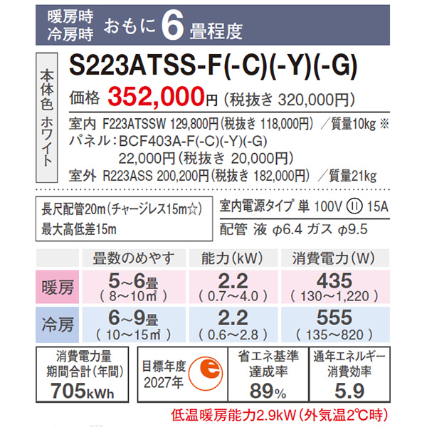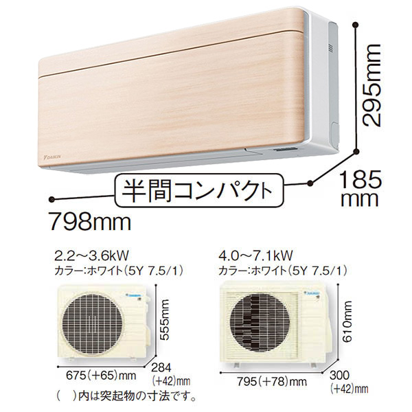 カテゴリ ルームエアコン 型番 S223ATSS-C 定価 320,000円 販売価格 税込 129,000円 送料 東京・神奈川全域:無料(一部地域や離島を除く) 詳細 ■メーカー:ダイキン ■モデル名:2023年モデル ■シリーズ名:risora SXシリーズ ■適用畳数:6畳用 ■カラー:ナチュラルウッド ■電源:単相100V ■室内機:F223ATSSW / パネル(BCF403A-C) ■室外機:R223ASS ●室内機サイズ:高295mm×幅798mm×奥行185mm ●室外機サイズ:高555mm×幅675(+65)mm×奥行284(+42)mm ■期間消費電力量(年間):705kWh ■その他機能等 ・プレミアム冷房 ・PIT制御 ・タフネス冷房・暖房 ・さらら除湿 ・自動運転 ・垂直気流 ・風ないス運転 ・ロング気流 ・オートスイング ※記載された情報は商品仕様の一部ですので、詳細はメーカーサイトにてご確認ください。 ※標準取付工事のほか、家電量販店では対応困難な『隠ぺい配管工事』も承ります。