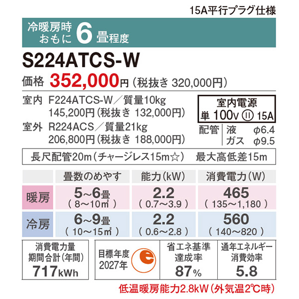 特記 東京ゼロエミポイント対象機種 カテゴリ ルームエアコン 型番 S224ATCS-WE 定価 352,000円 販売価格 税込 130,000円 送料 東京・神奈川全域:無料(一部地域や離島を除く) 詳細 ■メーカー:ダイキン ■モデル名:2024年モデル ■シリーズ名:CXシリーズ ■適用畳数:6畳用 ■カラー:ホワイト ■電源:単相100V ■室内機:F224ATCS-W ■室外機:R224ACS ●室内機サイズ:高さ250mm×幅798mm×奥行265mm ●室外機サイズ:高さ555mm×幅675(+65)mm×奥行284(+42)mm ■期間消費電力量(年間):717kWh ■その他機能等 ・海浜地域仕様 / 耐塩害(室外機) ・ストリーマ(空気清浄 / 内部クリーン) ・PIT制御 ・9段階セレクトドライ ・自動運転 ・オートスイング(上下/左右/立体) ・水内部クリーン(結露水洗浄) ・フィルター自動お掃除 ・タフネス冷房・暖房 ※記載された情報は商品仕様の一部ですので、詳細はメーカーサイトにてご確認ください。 ※標準取付工事のほか、家電量販店では対応困難な『隠ぺい配管工事』も承ります。