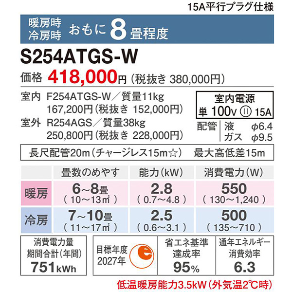 カテゴリ ルームエアコン 型番 S254ATGS-WE2 定価 430,000円 販売価格 税込 185,000円 送料 東京・神奈川全域:無料(一部地域や離島を除く) 詳細 ■メーカー:ダイキン ■モデル名:2024年モデル ■シリーズ名:GXシリーズ ■適用畳数:8畳用 ■カラー:ホワイト ■電源:単相100V ■室内機:F254ATGS-W ■室外機:R254AGS ●室内機サイズ:高さ295mm×幅798mm×奥行272mm ●室外機サイズ:高さ595mm×幅795(+78)mm×奥行300(+42)mm ■期間消費電力量(年間):751kWh ■その他機能等 ・海浜地域仕様 / 耐重塩害(室外機) ・ストリーマ(空気清浄 / 内部クリーン) ・さらら除湿 ・プレミアム冷房 ・快適自動運転 ・フィルター自動お掃除 ・水内部クリーン(結露水洗浄) ・タフネス冷房・暖房 ・室温パトロール ※記載された情報は商品仕様の一部ですので、詳細はメーカーサイトにてご確認ください。 ※標準取付工事のほか、家電量販店では対応困難な『隠ぺい配管工事』も承ります。