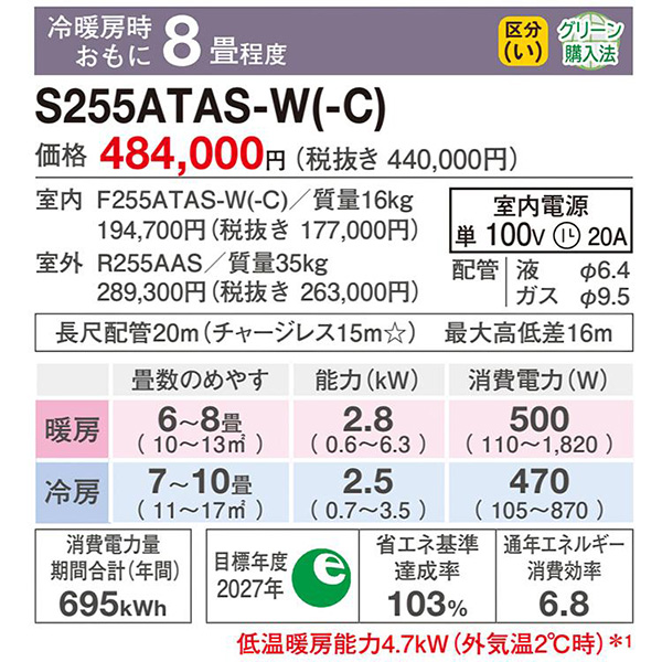 カテゴリ ルームエアコン 型番 S255ATAS-C 定価 440,000円 販売価格 税込 204,000円 送料 東京・神奈川全域:無料(一部地域や離島を除く) 詳細 ■メーカー:ダイキン ■モデル名:2025年モデル ■シリーズ名:AXシリーズ ■適用畳数:8畳用 ■カラー:ベージュ ■電源:単相100V ■室内機:F255ATAS-C ■室外機:R255AAS ●室内機サイズ:高さ295mm×幅798mm×奥行370mm ●室外機サイズ:高さ610mm×幅795(+78)mm×奥行300(+42)mm ■期間消費電力量(年間):695kWh ■その他機能等 ・ストリーマ(空気清浄 / 内部クリーン) ・さらら除湿 ・プレミアム冷房 ・人/床温度センサー ・AI快適自動運転 ・サーキュレーション気流 ・フィルター自動お掃除 ・水内部クリーン(結露水洗浄) ・しつどクリーン ※記載された情報は商品仕様の一部ですので、詳細はメーカーサイトにてご確認ください。 ※標準取付工事のほか、家電量販店では対応困難な『隠ぺい配管工事』も承ります。