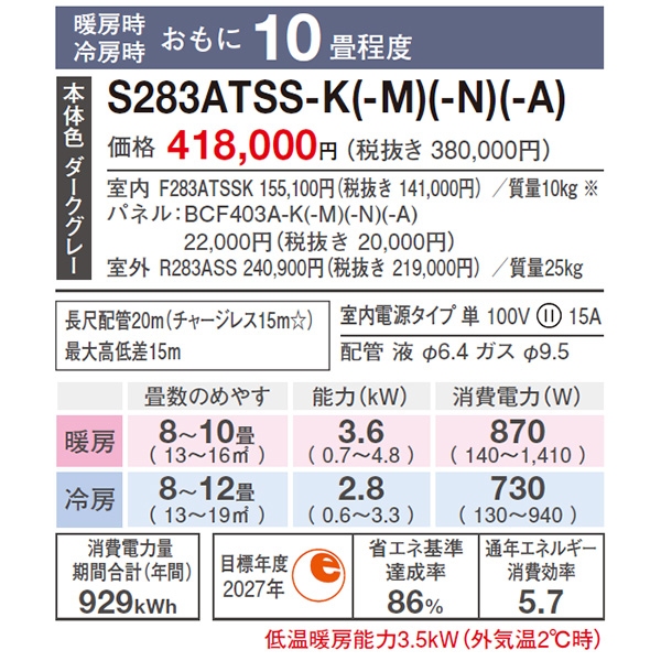 カテゴリ ルームエアコン 型番 S283ATSS-N 定価 380,000円 販売価格 税込 153,000円 送料 東京・神奈川全域:無料(一部地域や離島を除く) 詳細 ■メーカー:ダイキン ■モデル名:2023年モデル ■シリーズ名:risora SXシリーズ ■適用畳数:10畳用 ■カラー:ツイルゴールド ■電源:単相100V ■室内機:F223ATSSW / パネル(BCF403A-N) ■室外機:R283ASS ●室内機サイズ:高295mm×幅798mm×奥行185mm ●室外機サイズ:高555mm×幅675(+65)mm×奥行284(+42)mm ■期間消費電力量(年間):929kWh ■その他機能等 ・プレミアム冷房 ・PIT制御 ・タフネス冷房・暖房 ・さらら除湿 ・自動運転 ・垂直気流 ・風ないス運転 ・ロング気流 ・オートスイング ※記載された情報は商品仕様の一部ですので、詳細はメーカーサイトにてご確認ください。 ※標準取付工事のほか、家電量販店では対応困難な『隠ぺい配管工事』も承ります。