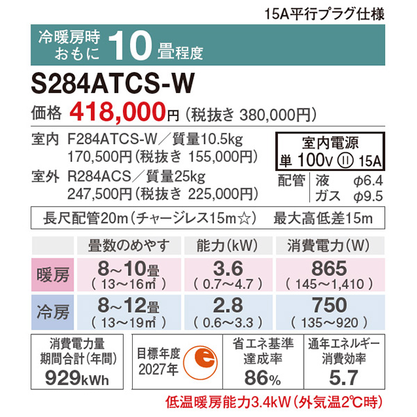カテゴリ ルームエアコン 型番 S284ATCS-W 定価 418,000円 販売価格 税込 127,000円 送料 東京・神奈川全域:無料(一部地域や離島を除く) 詳細 ■メーカー:ダイキン ■モデル名:2024年モデル ■シリーズ名:CXシリーズ ■適用畳数:10畳用 ■カラー:ホワイト ■電源:単相100V ■室内機:F284ATCS-W ■室外機:R284ACS ●室内機サイズ:高さ250mm×幅798mm×奥行265mm ●室外機サイズ:高さ555mm×幅675(+65)mm×奥行284(+42)mm ■期間消費電力量(年間):929kWh ■その他機能等 ・ストリーマ(空気清浄 / 内部クリーン) ・PIT制御 ・9段階セレクトドライ ・自動運転 ・オートスイング(上下/左右/立体) ・水内部クリーン(結露水洗浄) ・フィルター自動お掃除 ・タフネス冷房・暖房 ・風ないス運転 ※記載された情報は商品仕様の一部ですので、詳細はメーカーサイトにてご確認ください。 ※標準取付工事のほか、家電量販店では対応困難な『隠ぺい配管工事』も承ります。