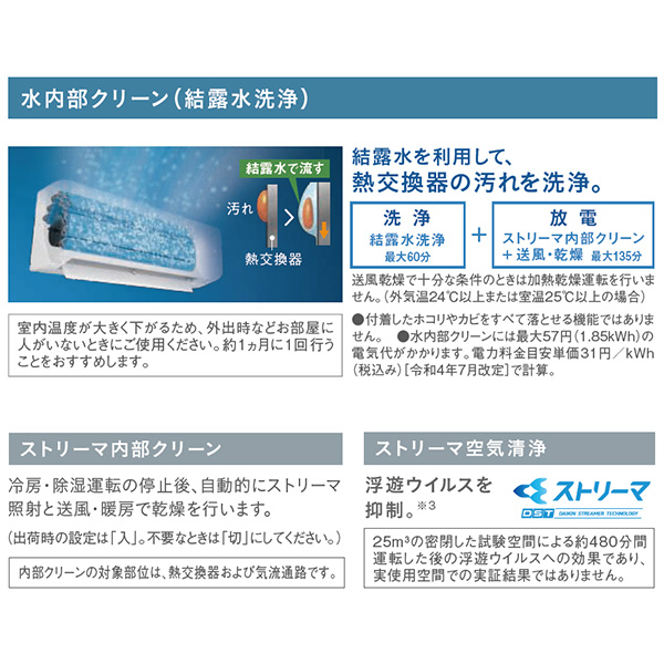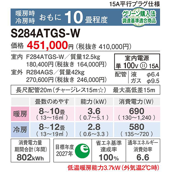 カテゴリ ルームエアコン 型番 S284ATGS-W 定価 410,000円 販売価格 税込 169,000円 送料 東京・神奈川全域:無料(一部地域や離島を除く) 詳細 ■メーカー:ダイキン ■モデル名:2024年モデル ■シリーズ名:GXシリーズ ■適用畳数:10畳用 ■カラー:ホワイト ■電源:単相100V ■室内機:F284ATGS-W ■室外機:R284AGS ●室内機サイズ:高さ295mm×幅798mm×奥行272mm ●室外機サイズ:高さ595mm×幅795(+78)mm×奥行300(+42)mm ■期間消費電力量(年間):802kWh ■その他機能等 ・ストリーマ(空気清浄 / 内部クリーン) ・さらら除湿 ・プレミアム冷房 ・快適自動運転 ・フィルター自動お掃除 ・水内部クリーン(結露水洗浄) ・タフネス冷房・暖房 ・室温パトロール ・風ないス運転 ※記載された情報は商品仕様の一部ですので、詳細はメーカーサイトにてご確認ください。 ※標準取付工事のほか、家電量販店では対応困難な『隠ぺい配管工事』も承ります。