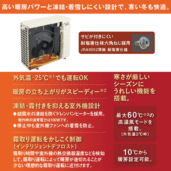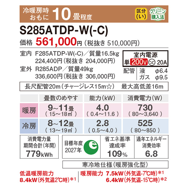 カテゴリ ルームエアコン 型番 S285ATDP-WE 定価 525,000円 販売価格 税込 244,000円 送料 東京・神奈川全域:無料(一部地域や離島を除く) 詳細 ■メーカー:ダイキン ■モデル名:2025年モデル ■シリーズ名:スゴ暖 DXシリーズ ■適用畳数:10畳用 ■カラー:ホワイト ■電源:単相200V ■室内機:F285ATDP-W ■室外機:R285ADP ●室内機サイズ:高さ295mm×幅798mm×奥行370mm ●室外機サイズ:高さ729mm×幅850(+89)mm×奥行320(+66)mm ■期間消費電力量(年間):779kWh ■その他機能等 ・寒冷地仕様 ・海浜地域仕様 / 耐塩害(室外機) ・ストリーマ(空気清浄 / 内部クリーン) ・さらら除湿 ・プレミアム冷房 ・霜付き抑制熱交換器 ・AI快適自動運転 ・フィルター自動お掃除 ・人/床温度センサー ※記載された情報は商品仕様の一部ですので、詳細はメーカーサイトにてご確認ください。 ※標準取付工事のほか、家電量販店では対応困難な『隠ぺい配管工事』も承ります。