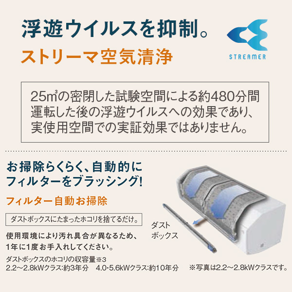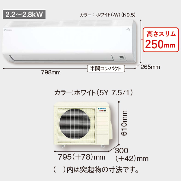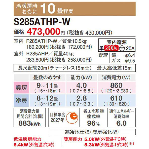 カテゴリ ルームエアコン 型番 S285ATHP-WE 定価 445,000円 販売価格 税込 193,000円 送料 東京・神奈川全域:無料(一部地域や離島を除く) 詳細 ■メーカー:ダイキン ■モデル名:2025年モデル ■シリーズ名:スゴ暖 HXシリーズ ■適用畳数:10畳用 ■カラー:ホワイト ■電源:単相200V ■室内機:F285ATHP-W ■室外機:R285AHP ●室内機サイズ:高さ250mm×幅798mm×奥行265mm ●室外機サイズ:高さ610mm×幅795(+78)mm×奥行300(+42)mm ■期間消費電力量(年間):883kWh ■その他機能等 ・寒冷地仕様 ・海浜地域仕様 / 耐塩害(室外機) ・ストリーマ(空気清浄 / 内部クリーン) ・高温風モード ・室温パトロール ・ヒートブースト制御 ・水内部クリーン(結露水洗浄) ・フィルター自動お掃除 ・9段階セレクトドライ ※記載された情報は商品仕様の一部ですので、詳細はメーカーサイトにてご確認ください。 ※標準取付工事のほか、家電量販店では対応困難な『隠ぺい配管工事』も承ります。
