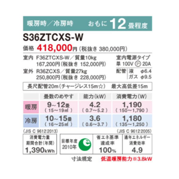 S36ZTCXS-W ダイキン ルームエアコン CXシリーズ 主に12畳用 ホワイト 2022年モデル ストリーマ