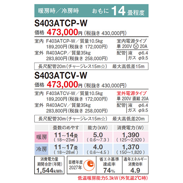 カテゴリ ルームエアコン 型番 S403ATCP-W 定価 430,000円 販売価格 税込 166,000円 送料 東京・神奈川全域:無料(一部地域や離島を除く) 詳細 ■メーカー:ダイキン ■モデル名:2023年モデル ■シリーズ名:CXシリーズ ■適用畳数:14畳用 ■カラー:ホワイト ■電源:単相200V ■室内機:F403ATCS-W ■室外機:R403ACS ●室内機サイズ:高さ250mm×幅798mm×奥行265mm ●室外機サイズ:高さ610mm×幅795(+78)mm×奥行300(+42)mm ■期間消費電力量(年間):1544kWh ■その他機能等 ・PIT制御 ・ヒートブースト制御(暖房運転時) ・9段階セレクトドライ ・自動運転 ・フィルター自動お掃除 ・室温パトロール ・ストリーマ空気清浄 ・ストリーマ内部クリーン ・水内部クリーン ※記載された情報は商品仕様の一部ですので、詳細はメーカーサイトにてご確認ください。 ※標準取付工事のほか、家電量販店では対応困難な『隠ぺい配管工事』も承ります。
