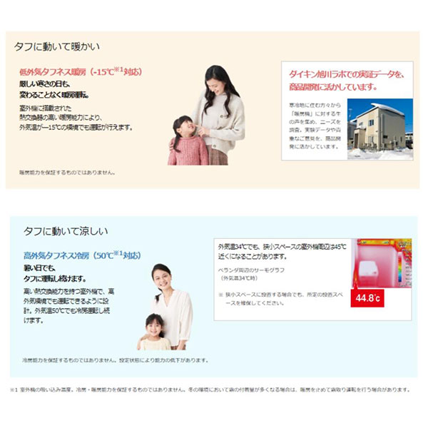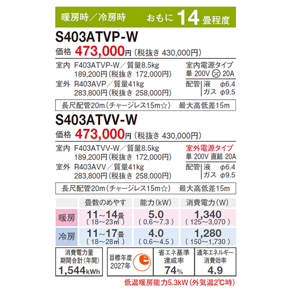 カテゴリ ルームエアコン 型番 S403ATVP-W 定価 430,000円 販売価格 税込 199,000円 送料 東京・神奈川全域:無料(一部地域や離島を除く) 詳細 ■メーカー:ダイキン ■モデル名:2023年モデル ■シリーズ名:VXシリーズ ■適用畳数:14畳用 ■カラー:ホワイト ■電源:単相200V ■室内機:F403ATVP ■室外機:R403AVP ●室内機サイズ:高さ285mm×幅798mm×奥行248mm ●室外機サイズ:高さ708mm×幅795(+78)mm×奥行300(+42)mm ■期間消費電力量(年間):1544kWh ■その他機能等 ・換気(給気換気) ・水内部クリーン(結露水洗浄) ・ストリーマ内部クリーン ・ストリーマ空気清浄 ・室温パトロール ・低外気タフネス暖房 ・高外気タフネス冷房 ・快適エコ自動 ・ヒートブースト制御 ※記載された情報は商品仕様の一部ですので、詳細はメーカーサイトにてご確認ください。 ※標準取付工事のほか、家電量販店では対応困難な『隠ぺい配管工事』も承ります。