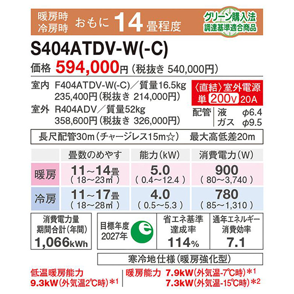 カテゴリ ルームエアコン 型番 S404ATDV-W 定価 540,000円 販売価格 税込 221,100円 送料 東京・神奈川全域:無料(一部地域や離島を除く) 詳細 ■メーカー:ダイキン ■モデル名:2024年モデル ■シリーズ名:スゴ暖 DXシリーズ ■適用畳数:14畳用 ■カラー:ホワイト ■電源:単相200V ■室内機:F404ATDV-W ■室外機:R404ADV ●室内機サイズ:高さ295mm×幅798mm×奥行370mm ●室外機サイズ:高さ729mm×幅850(+89)mm×奥行320(+72)mm ■期間消費電力量(年間):1066kWh ■その他機能等 ・室外電源 ・寒冷地仕様 ・プレミアム冷房 ・さらら除湿(リニアハイブリッド) ・AI快適自動 ・節電自動 ・タフネス冷房/暖房 ・フィルター自動お掃除 ・人・床温度センサー(人・床・壁) ・ストリーマ(空気清浄/内部クリーン) ・水内部クリーン(結露水洗浄) ※記載された情報は商品仕様の一部ですので、詳細はメーカーサイトにてご確認ください。 ※標準取付工事のほか、家電量販店では対応困難な『隠ぺい配管工事』も承ります。