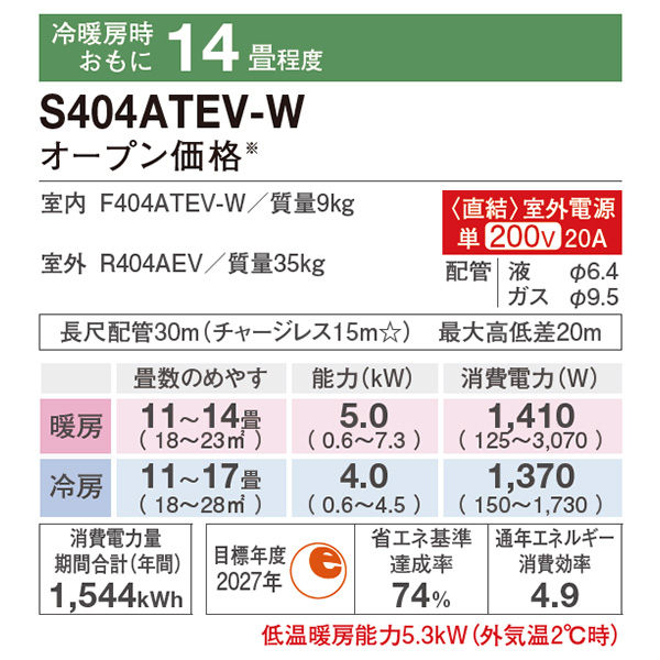 特記 東京ゼロエミポイント対象機種 カテゴリ ルームエアコン 型番 S404ATEV-WE2 定価 オープン価格 販売価格 税込 203,000円 送料 東京・神奈川全域:無料(一部地域や離島を除く) 詳細 ■メーカー:ダイキン ■モデル名:2024年モデル ■シリーズ名:Eシリーズ ■適用畳数:14畳用 ■カラー:ホワイト ■電源:単相200V ■室内機:F404ATEV-W ■室外機:R404AEV ●室内機サイズ:高さ250mm×幅798mm×奥行255mm ●室外機サイズ:高さ610mm×幅795(+78)mm×奥行300(+42)mm ■期間消費電力量(年間):1544kWh ■その他機能等 ・海浜地域仕様 / 耐重塩害(室外機) ・室外電源 ・ストリーマ(空気清浄 / 内部クリーン) ・PIT制御 ・タフネス冷房・暖房 ・9段階セレクトドライ ・自動運転 ・風ないス運転 ・オートスイング上下 ※記載された情報は商品仕様の一部ですので、詳細はメーカーサイトにてご確認ください。 ※標準取付工事のほか、家電量販店では対応困難な『隠ぺい配管工事』も承ります。