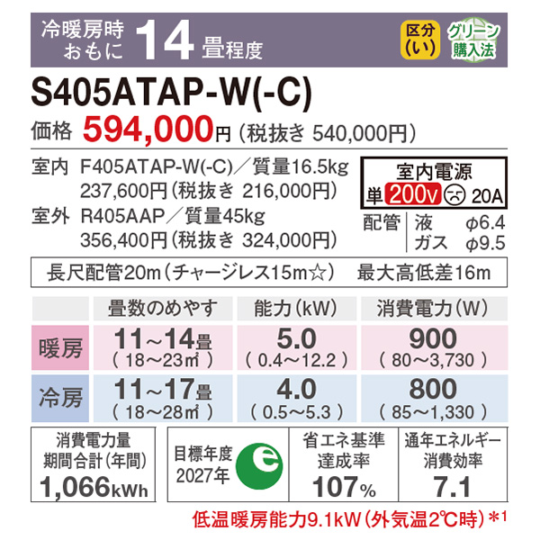 カテゴリ ルームエアコン 型番 S405ATAP-WE2 定価 600,000円 販売価格 税込 278,000円 送料 東京・神奈川全域:無料(一部地域や離島を除く) 詳細 ■メーカー:ダイキン ■モデル名:2025年モデル ■シリーズ名:AXシリーズ ■適用畳数:14畳用 ■カラー:ホワイト ■電源:単相200V ■室内機:F405ATAP-W ■室外機:R405AAP ●室内機サイズ:高さ295mm×幅798mm×奥行370mm ●室外機サイズ:高さ666mm×幅850(+89)mm×奥行320(+66)mm ■期間消費電力量(年間):1066kWh ■その他機能等 ・海浜地域仕様 / 耐重塩害(室外機) ・ストリーマ(空気清浄 / 内部クリーン) ・さらら除湿 ・プレミアム冷房 ・人/床温度センサー ・AI快適自動運転 ・サーキュレーション気流 ・フィルター自動お掃除 ・水内部クリーン(結露水洗浄) ※記載された情報は商品仕様の一部ですので、詳細はメーカーサイトにてご確認ください。 ※標準取付工事のほか、家電量販店では対応困難な『隠ぺい配管工事』も承ります。