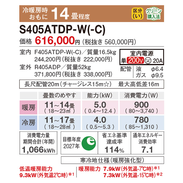 カテゴリ ルームエアコン 型番 S405ATDP-C 定価 560,000円 販売価格 税込 260,000円 送料 東京・神奈川全域:無料(一部地域や離島を除く) 詳細 ■メーカー:ダイキン ■モデル名:2025年モデル ■シリーズ名:スゴ暖 DXシリーズ ■適用畳数:14畳用 ■カラー:ベージュ ■電源:単相200V ■室内機:F405ATDP-C ■室外機:R405ADP ●室内機サイズ:高さ295mm×幅798mm×奥行370mm ●室外機サイズ:高さ729mm×幅850(+89)mm×奥行320(+72)mm ■期間消費電力量(年間):1066kWh ■その他機能等 ・寒冷地仕様 ・ストリーマ(空気清浄 / 内部クリーン) ・さらら除湿 ・プレミアム冷房 ・霜付き抑制熱交換器 ・AI快適自動運転 ・フィルター自動お掃除 ・人/床温度センサー ・室温パトロール ※記載された情報は商品仕様の一部ですので、詳細はメーカーサイトにてご確認ください。 ※標準取付工事のほか、家電量販店では対応困難な『隠ぺい配管工事』も承ります。