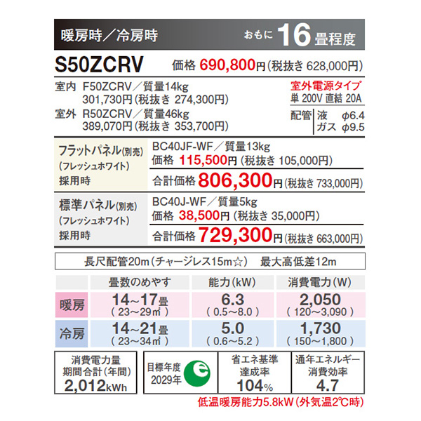 カテゴリ ハウジングエアコン 型番 S50ZCRV(標準パネル) 定価 663,000円 販売価格 税込 334,000円 詳細 ■メーカー:ダイキン ■モデル名:2022年モデル ■シリーズ名:CRシリーズ ■タイプ名:天井埋込形1方向 ■適用畳数:16畳用 ■パネルカラー:BC40J-WF(フレッシュホワイト) / BC40J-W(ホワイト) / BC40J-T(ブラウン) / BC40J-M(木目) ■電源:単相200V ■室内機:F50ZCRV ■室外機:R50ZCRV ●室内機サイズ:高さ185mm×幅990mm×奥行360mm ●室外機サイズ:高さ708mm×幅795(+78)mm×奥行300(+42)mm ■期間消費電力量(年間):2012kWh ■その他機能等 ・室外電源 ・うるる加湿(無給水加湿) ・さらら除湿 ・おまかせ自動運転 ・2WAYすみずみ気流 ・快眠運転(うるる快眠プログラム) ・ダブルブロック空気清浄 ・給気換気 / るすばん換気 ・フィルター自動お掃除 ※記載された情報は商品仕様の一部ですので、詳細はメーカーサイトにてご確認ください。 ※標準取付工事のほか、家電量販店では対応困難な『隠ぺい配管工事』も承ります。