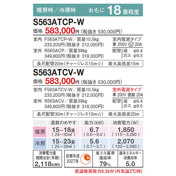 カテゴリ ルームエアコン 型番 S563ATCP-WE2 定価 590,000円 販売価格 税込 228,000円 送料 東京・神奈川全域:無料(一部地域や離島を除く) 詳細 ■メーカー:ダイキン ■モデル名:2023年モデル ■シリーズ名:CXシリーズ ■適用畳数:18畳用 ■カラー:ホワイト ■電源:単相200V ■室内機:F563ATCP-W ■室外機:R563ATCP ●室内機サイズ:高さ250mm×幅798mm×奥行265mm ●室外機サイズ:高さ610mm×幅795(+78)mm×奥行300(+42)mm ■期間消費電力量(年間):2118kWh ■その他機能等 ・海浜地域仕様 / 耐重塩害(室外機) ・PIT制御 ・ヒートブースト制御(暖房運転時) ・9段階セレクトドライ ・自動運転 ・フィルター自動お掃除 ・ストリーマ空気清浄 ・ストリーマ内部クリーン ・室温パトロール ※記載された情報は商品仕様の一部ですので、詳細はメーカーサイトにてご確認ください。 ※標準取付工事のほか、家電量販店では対応困難な『隠ぺい配管工事』も承ります。
