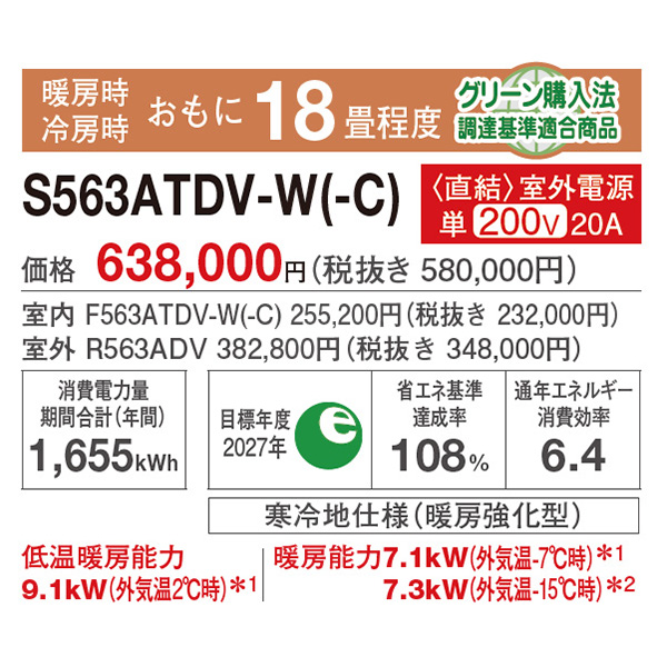 カテゴリ ルームエアコン 型番 S563ATDV-CE 定価 595,000円 販売価格 税込 299,000円 送料 東京・神奈川全域:無料(一部地域や離島を除く) 詳細 ■メーカー:ダイキン ■モデル名:2023年モデル ■シリーズ名:スゴ暖 DXシリーズ ■適用畳数:18畳用 ■カラー:ベージュ ■電源:単相200V ■室内機:F563ATDV-C ■室外機:R563ADV ●室内機サイズ:高さ295mm×幅798mm×奥行370mm ●室外機サイズ:高さ666mm×幅850(+74)mm×奥行320(+66)mm ■期間消費電力量(年間):1655kWh ■その他機能等 ・室外電源 ・寒冷地仕様 ・海浜地域仕様 / 耐塩害(室外機) ・プレミアム冷房 ・さらら除湿 ・AI快適自動運転 ・垂直気流(暖房・冷房) ・ストリーマ(空気清浄 / 内部クリーン) ・高温風モード(60℃吹出し) ・10℃からの暖房設定 ※記載された情報は商品仕様の一部ですので、詳細はメーカーサイトにてご確認ください。 ※標準取付工事のほか、家電量販店では対応困難な『隠ぺい配管工事』も承ります。
