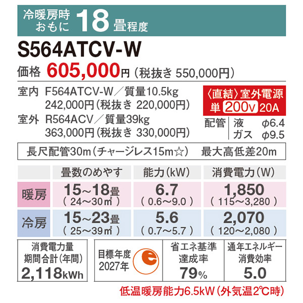 特記 東京ゼロエミポイント対象機種 カテゴリ ルームエアコン 型番 S564ATCV-W 定価 605,000円 販売価格 税込 196,000円 送料 東京・神奈川全域:無料(一部地域や離島を除く) 詳細 ■メーカー:ダイキン ■モデル名:2024年モデル ■シリーズ名:CXシリーズ ■適用畳数:18畳用 ■カラー:ホワイト ■電源:単相200V ■室内機:F564ATCV-W ■室外機:R564ACV ●室内機サイズ:高さ250mm×幅798mm×奥行265mm ●室外機サイズ:高さ610mm×幅795(+78)mm×奥行300(+42)mm ■期間消費電力量(年間):2118kWh ■その他機能等 ・ストリーマ(空気清浄 / 内部クリーン) ・室外電源 ・PIT制御 ・9段階セレクトドライ ・自動運転 ・オートスイング(上下/左右/立体) ・水内部クリーン(結露水洗浄) ・フィルター自動お掃除 ・タフネス冷房・暖房 ※記載された情報は商品仕様の一部ですので、詳細はメーカーサイトにてご確認ください。 ※標準取付工事のほか、家電量販店では対応困難な『隠ぺい配管工事』も承ります。