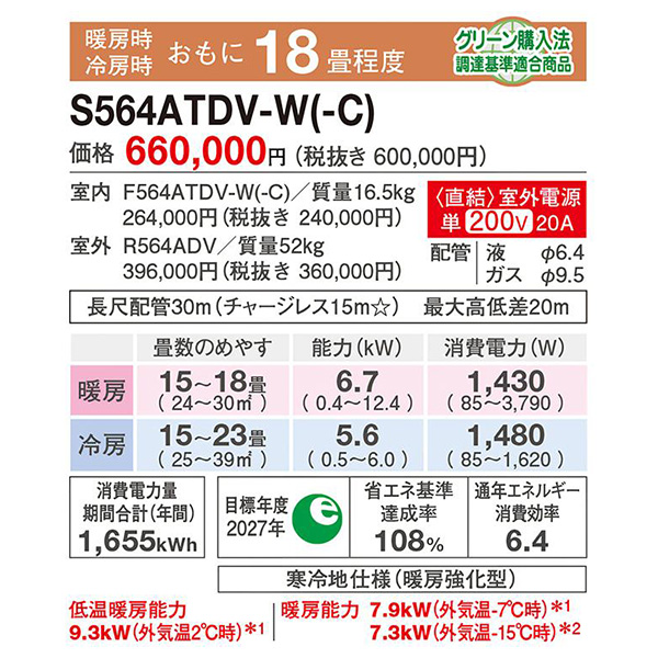 カテゴリ ルームエアコン 型番 S564ATDV-W 定価 600,000円 販売価格 税込 250,800円 送料 東京・神奈川全域:無料(一部地域や離島を除く) 詳細 ■メーカー:ダイキン ■モデル名:2024年モデル ■シリーズ名:スゴ暖 DXシリーズ ■適用畳数:18畳用 ■カラー:ホワイト ■電源:単相200V ■室内機:F564ATDV-W ■室外機:R564ADV ●室内機サイズ:高さ295mm×幅798mm×奥行370mm ●室外機サイズ:高さ729mm×幅850(+89)mm×奥行320(+72)mm ■期間消費電力量(年間):1655kWh ■その他機能等 ・室外電源 ・寒冷地仕様 ・プレミアム冷房 ・さらら除湿(リニアハイブリッド) ・AI快適自動 ・節電自動 ・タフネス冷房/暖房 ・フィルター自動お掃除 ・人・床温度センサー(人・床・壁) ・ストリーマ(空気清浄/内部クリーン) ・水内部クリーン(結露水洗浄) ※記載された情報は商品仕様の一部ですので、詳細はメーカーサイトにてご確認ください。 ※標準取付工事のほか、家電量販店では対応困難な『隠ぺい配管工事』も承ります。
